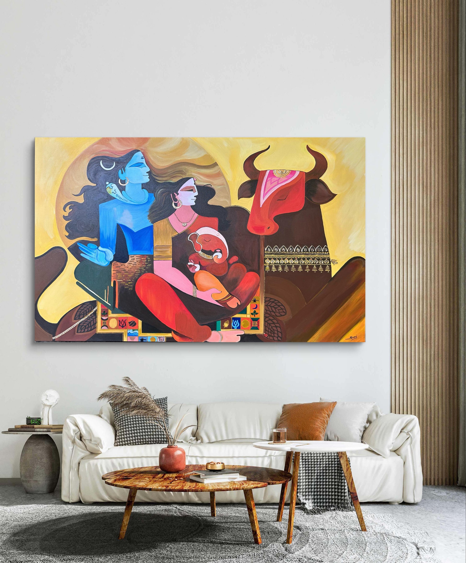 Invite divine blessings and serene energy into your home with this Handmade Abstract Shiva Parivar Texture Art. Depicting Lord Shiva, Goddess Parvati, Lord Ganesha, and the sacred bull Nandi in a graceful abstract form, the piece radiates togetherness, love, and positive vibrations.