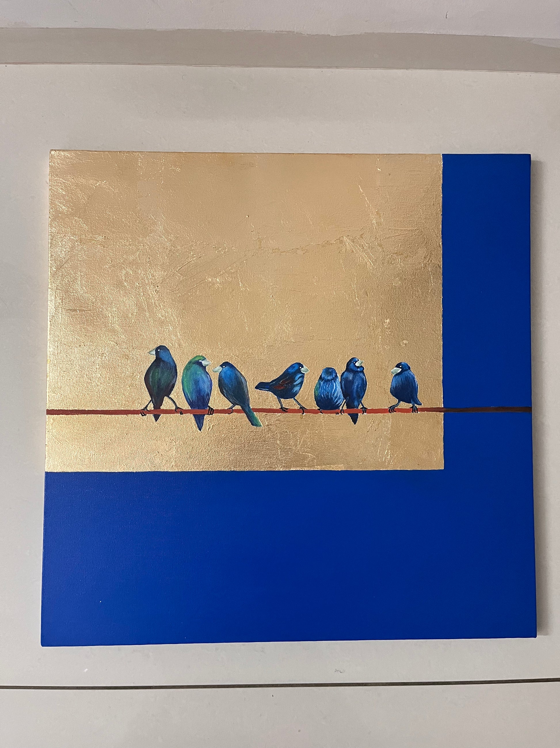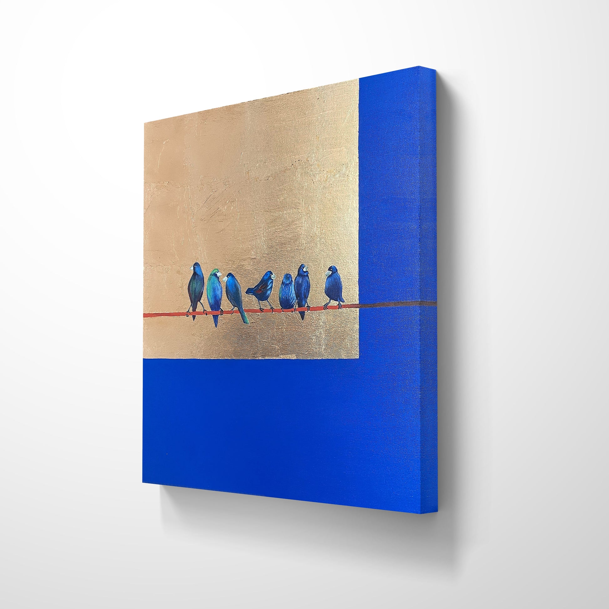 A calming and elegant artwork featuring blue birds perched on a wire, surrounded by rich gold and deep blue tones. This piece symbolizes companionship, stillness, and harmony — perfect for modern, minimal, or nature-inspired interiors.