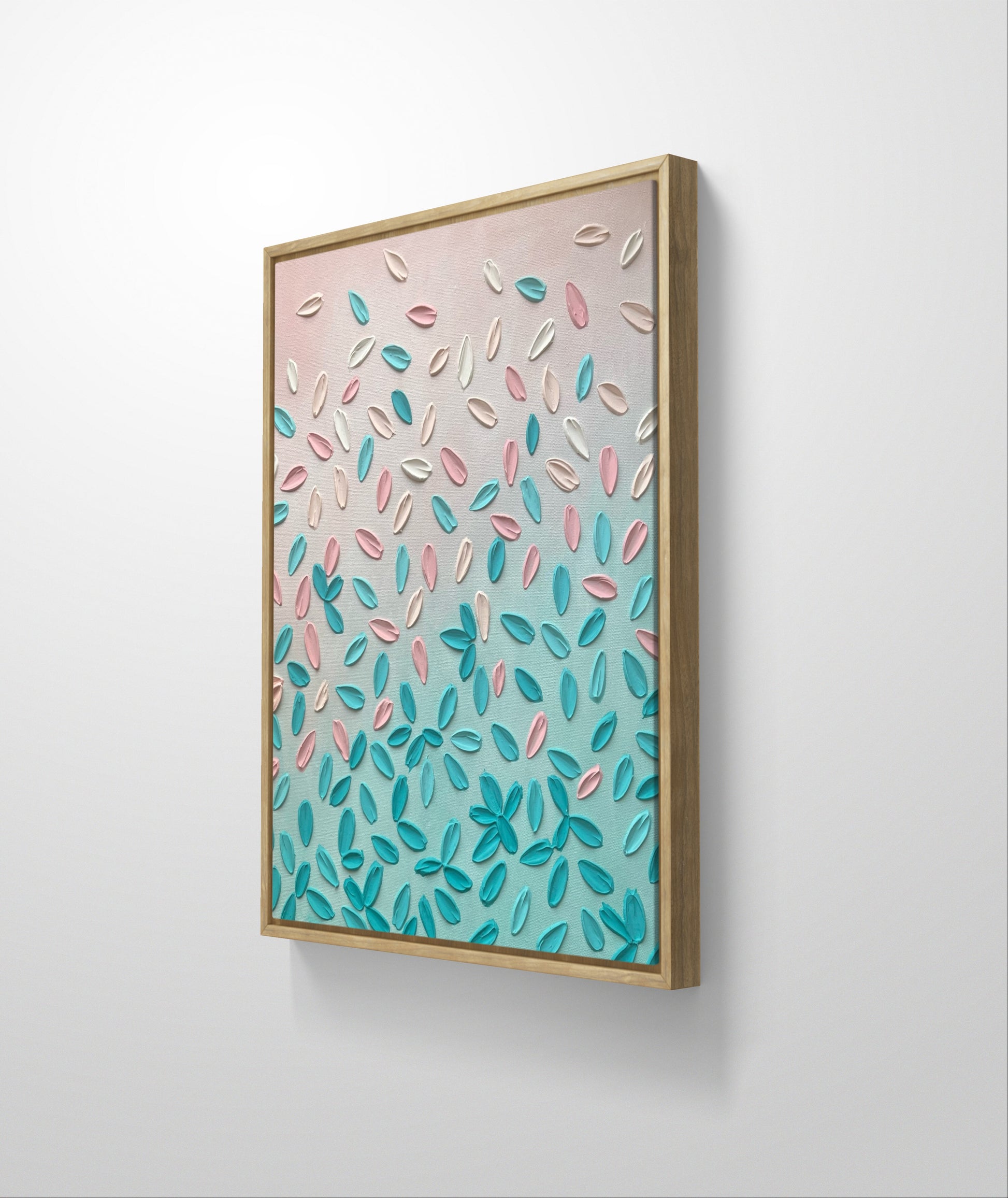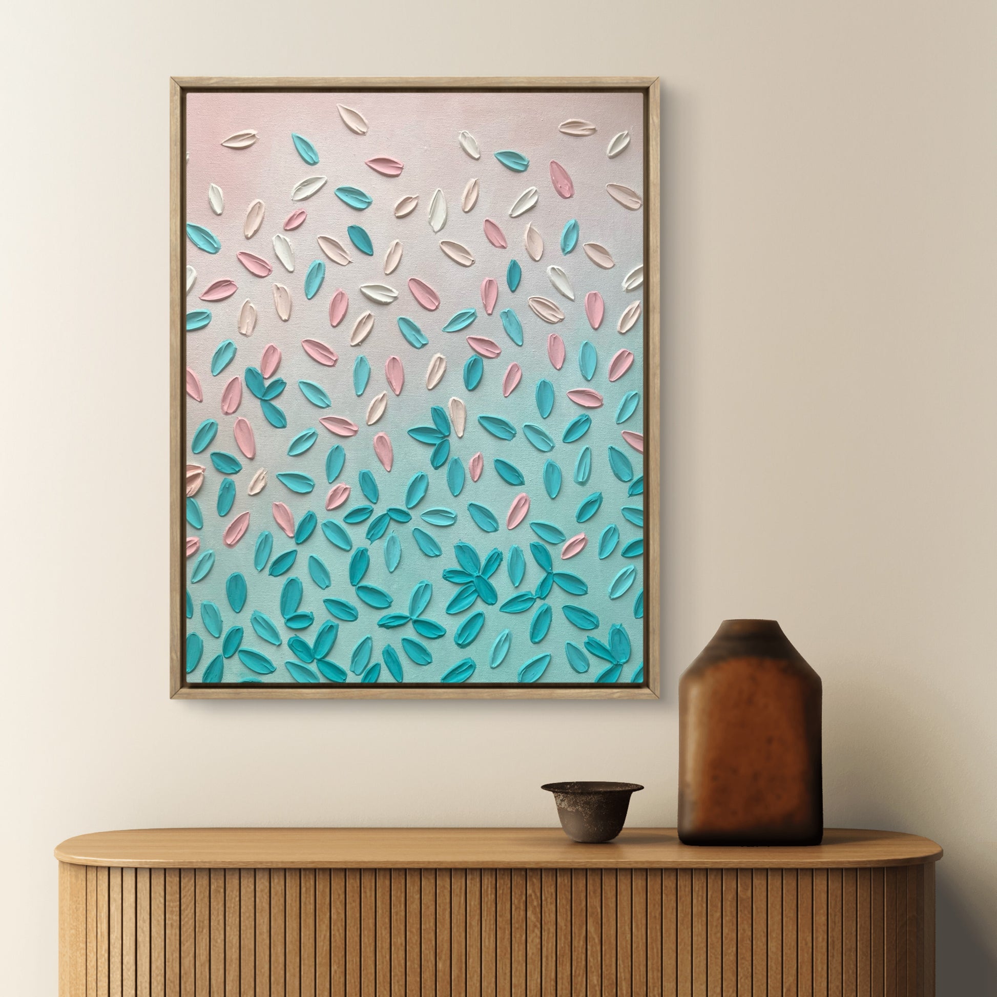 This artwork is a soft and playful mix of colors and texture. Tiny raised petals in shades of teal, pink, and white scatter across the canvas like they're floating in the breeze. The background blends gently from a pale blush at the top to a calming turquoise at the bottom, creating a light and airy feel.