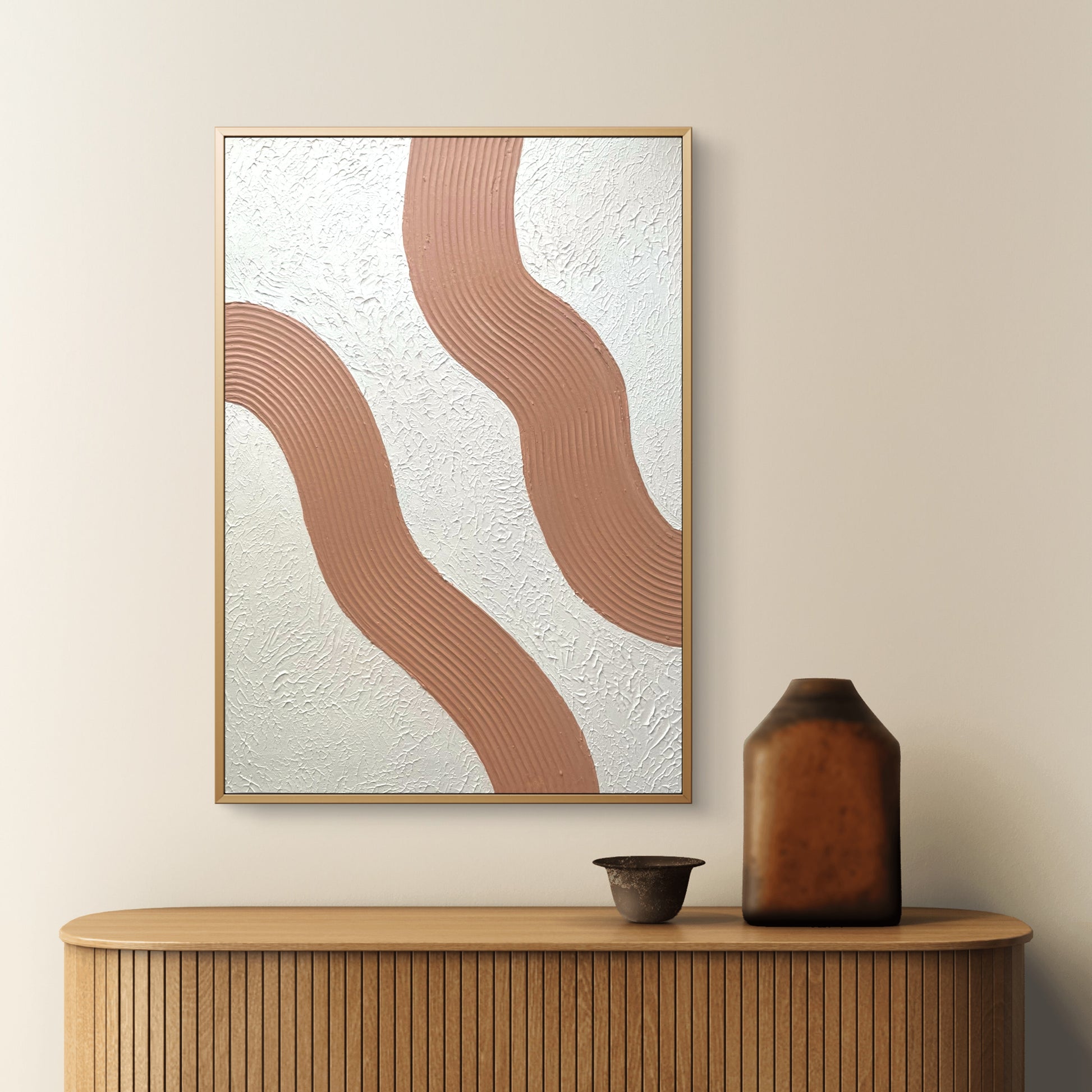 This artwork features soft, wavy lines in a warm terracotta color flowing across a textured white background. The raised lines add a playful touch while keeping the design simple and clean.