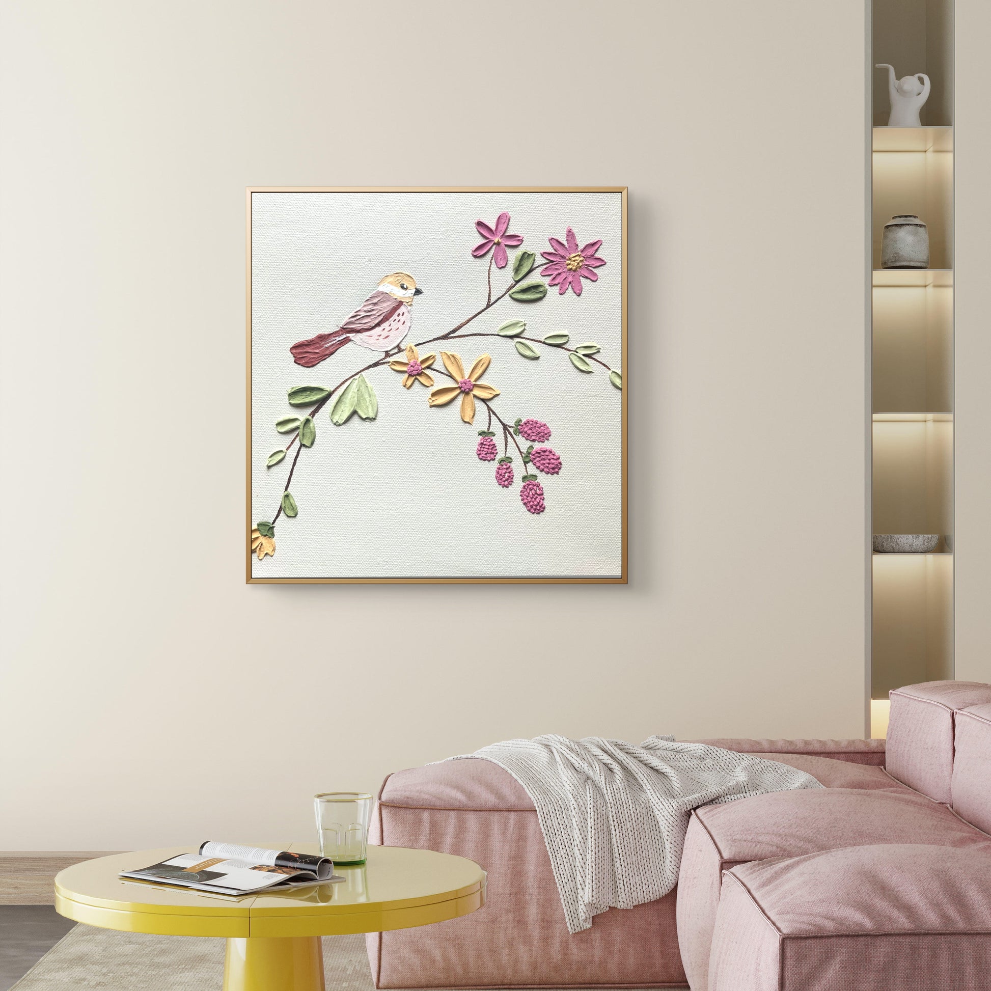 This artwork shows a cute little bird sitting on a branch filled with colorful flowers and berries. The colors are soft and cheerful, with shades of pink, yellow, and green that make the piece feel happy and light.