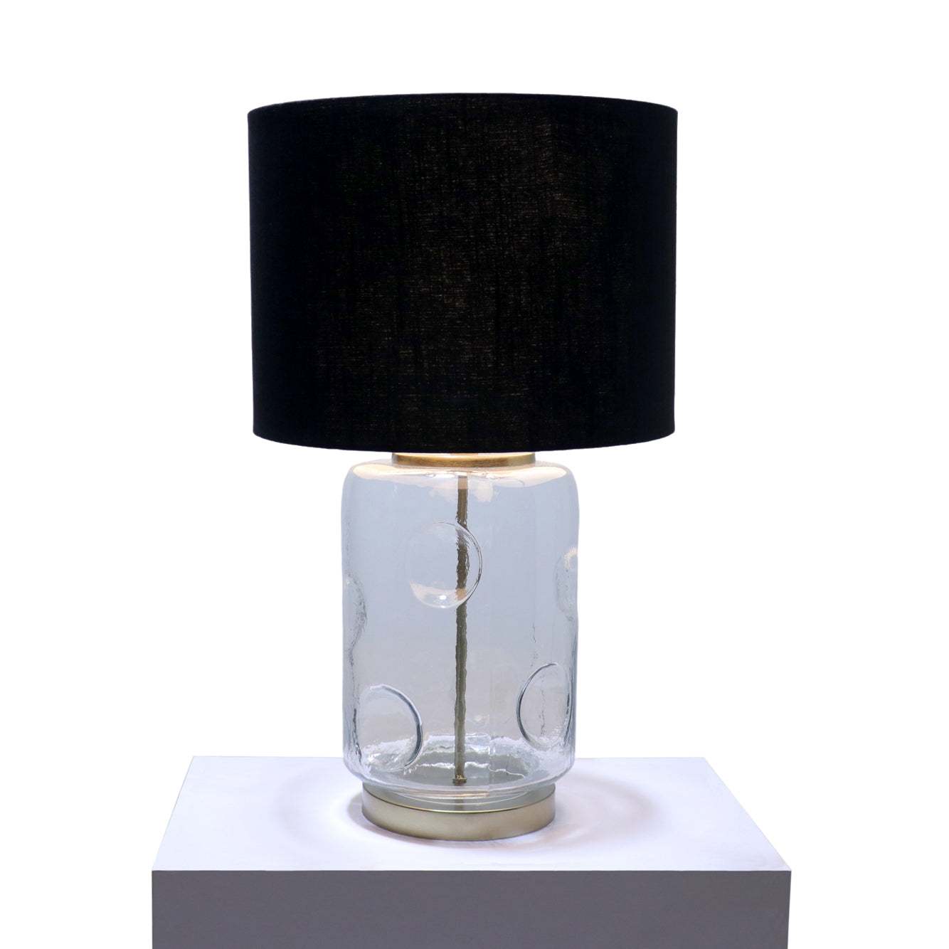 GLANZ: With an antique brass finished foot, pipe, and finial, GLANZ lamp features a glass base with debossed circles, and a luxury slub cotton black shade. Display it in a living space of any style from mid-century modern to experience luxurious vibes only.