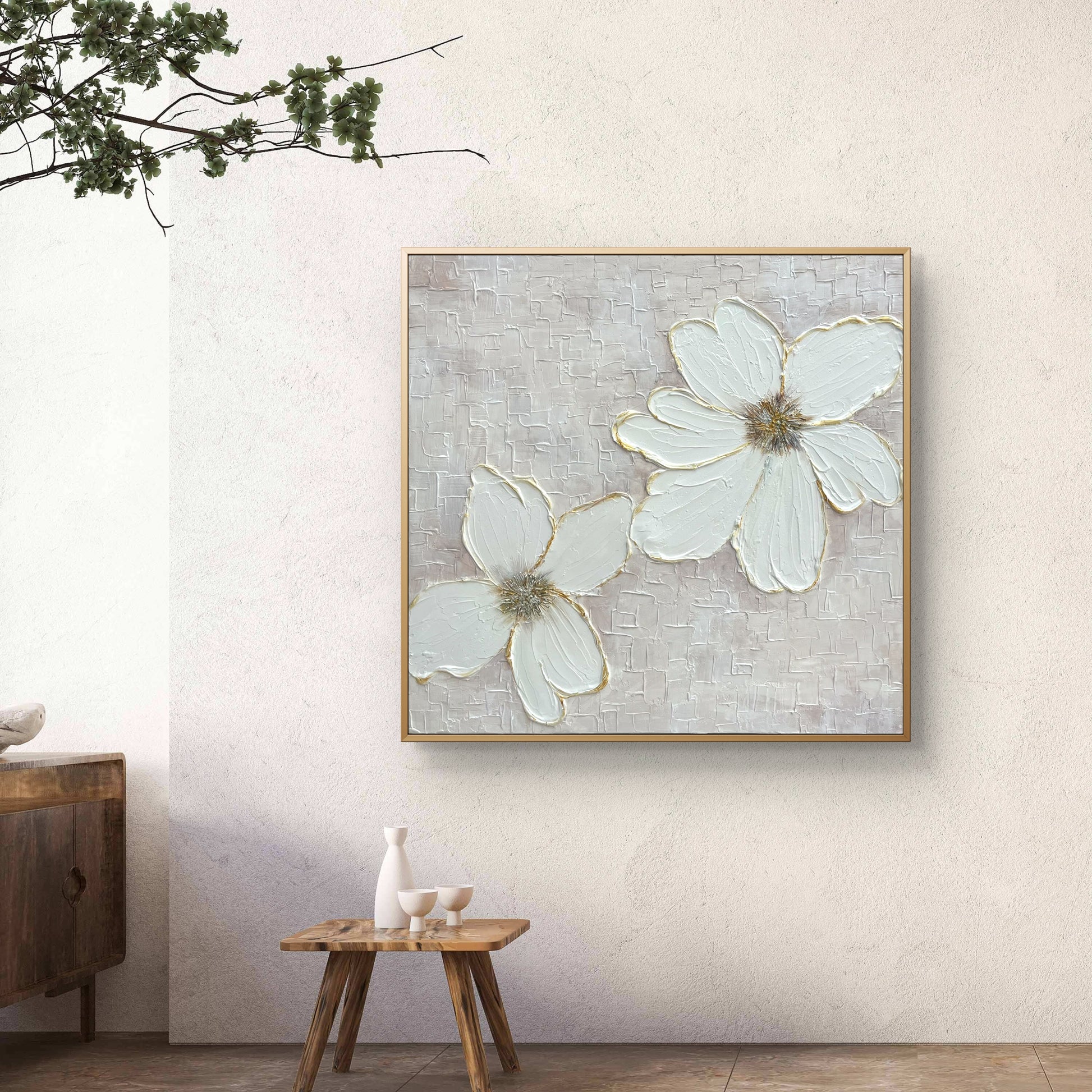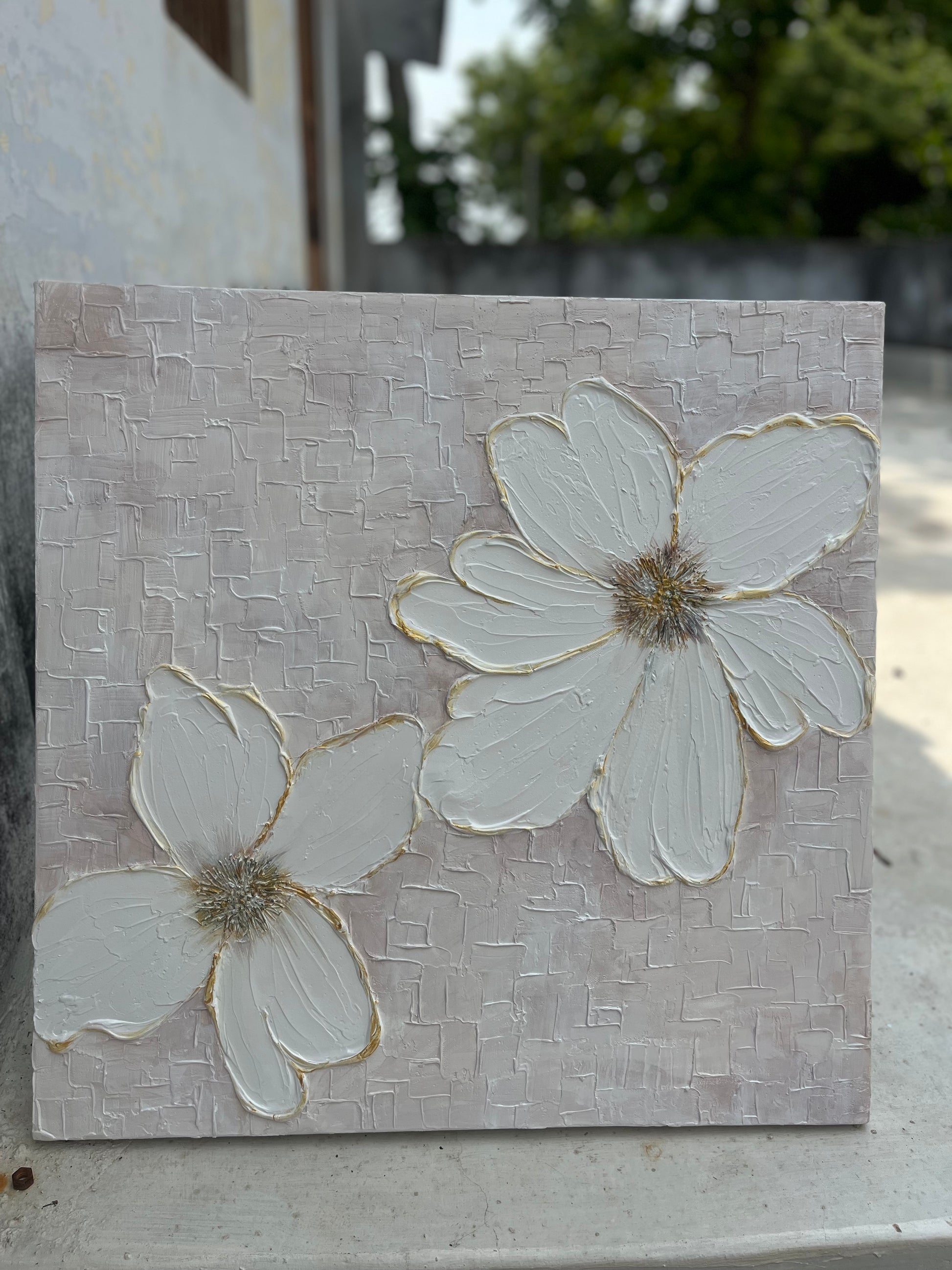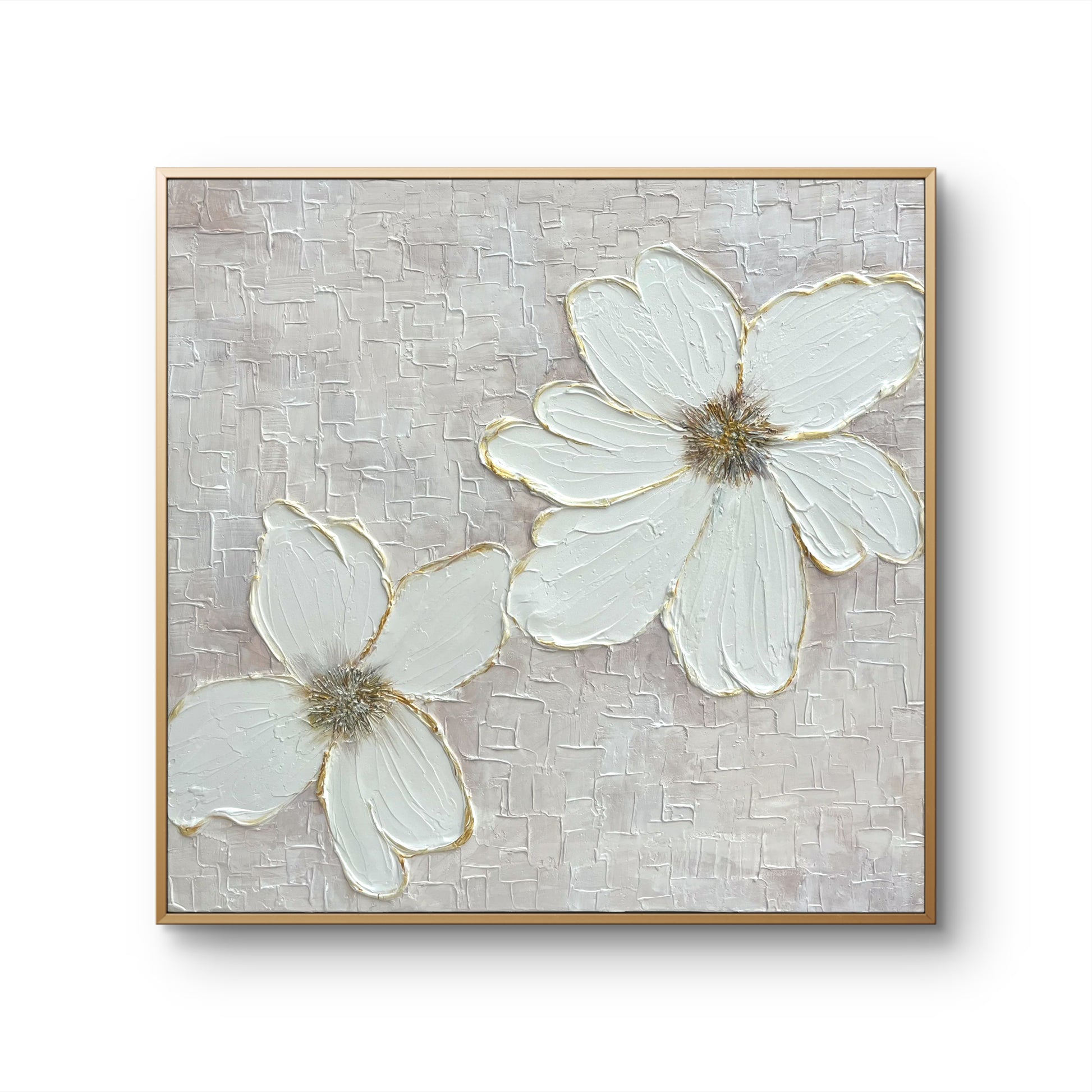 A richly textured floral artwork crafted with delicate layers, featuring white petals outlined in gold acrylic. The woven-style texture adds depth and charm, making it perfect for any modern or luxury interior setting.