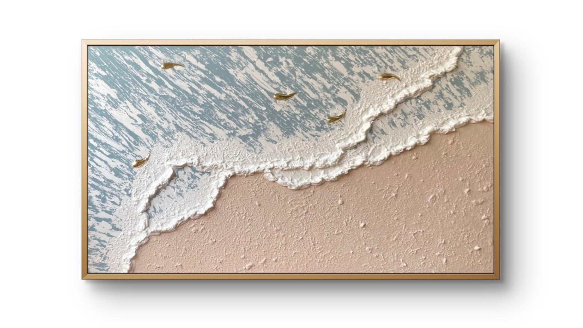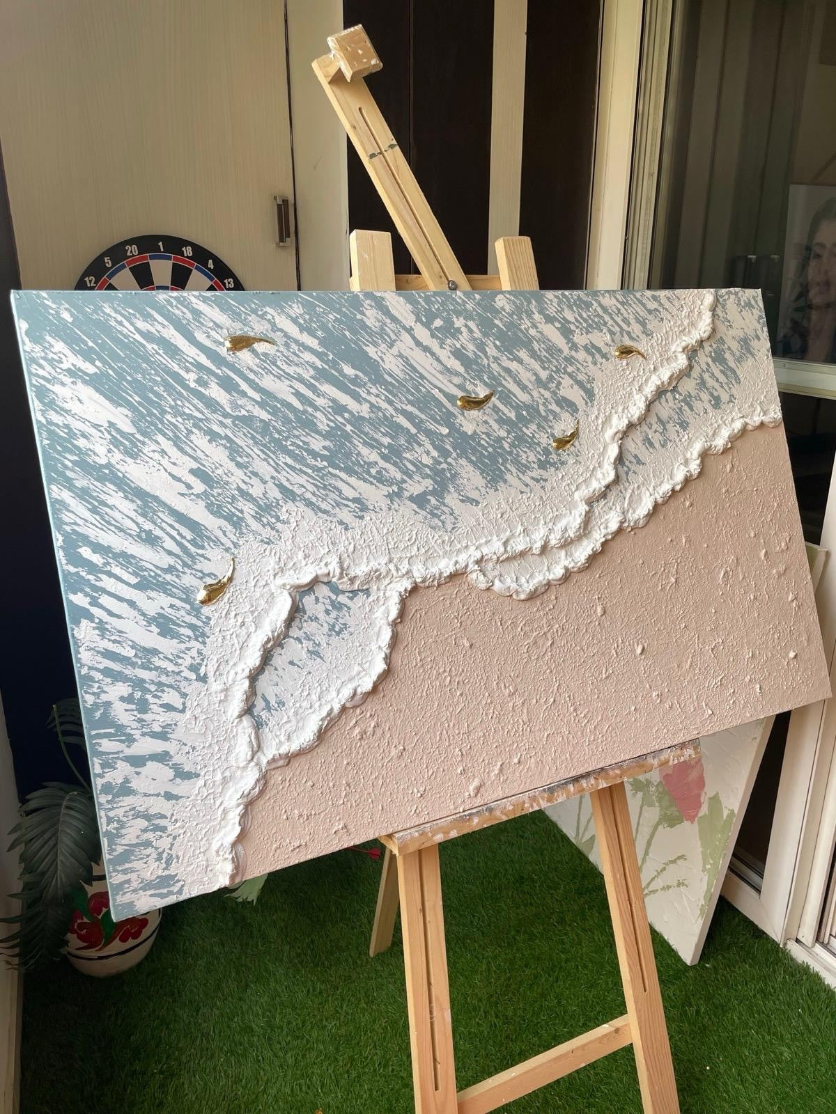 "Golden Fish in the Surf" is a mesmerizing fusion of the ocean’s fluidity and the symbolic beauty of fish, brought to life in a dynamic interplay of color and movement. The painting evokes the essence of the sea—wild, unpredictable, and full of hidden wonders—while capturing the graceful dance of golden fish swimming through the very waves that shape their world.