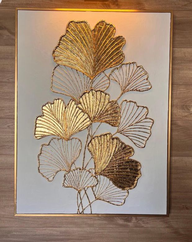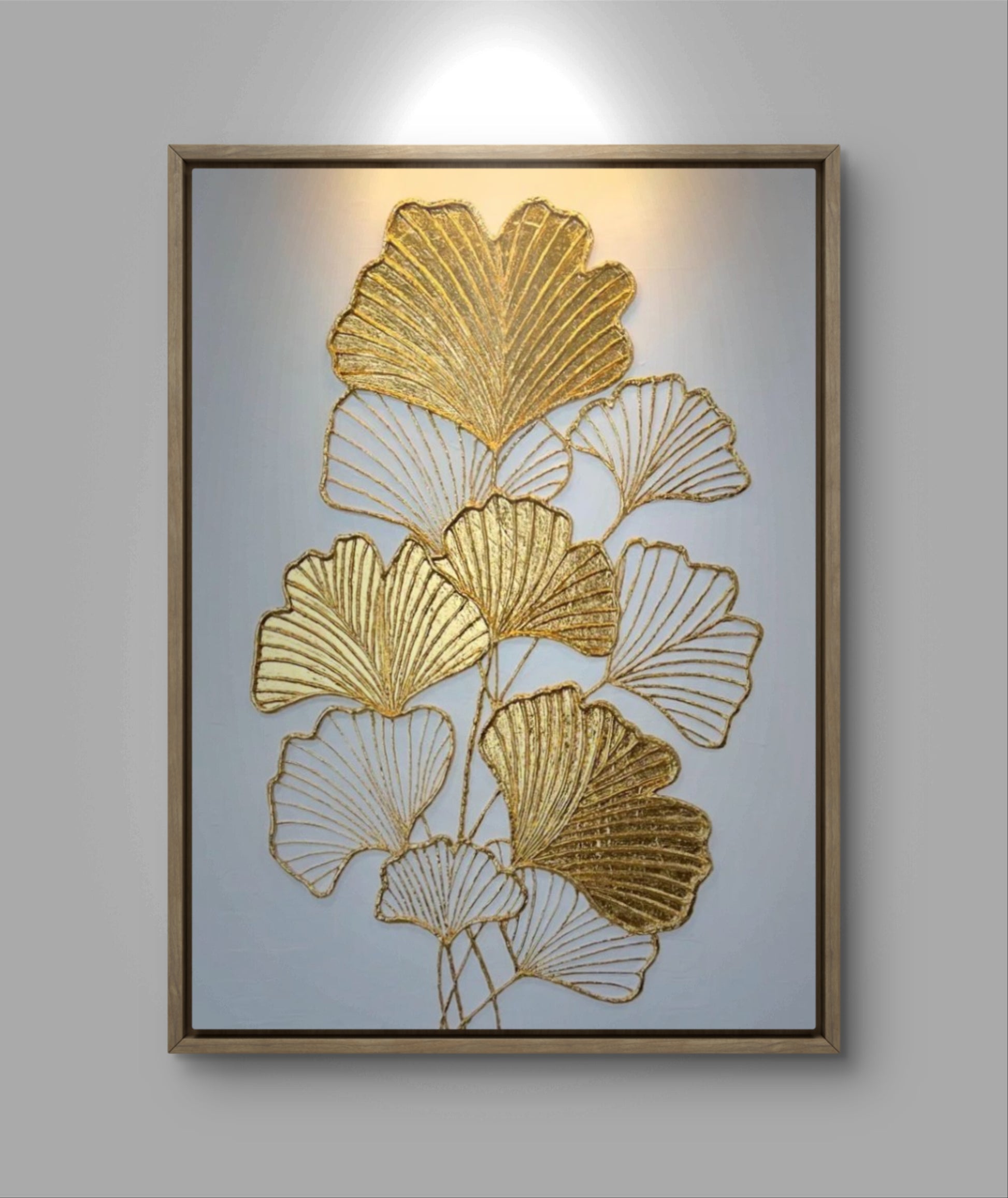 This artwork beautifully showcases a cluster of ginkgo leaves crafted with textured detailing and highlighted in rich golden tones. The metallic finish adds depth and elegance, while the delicate leaf patterns symbolize longevity, resilience, and harmony. Set against a subtle background with a golden fibre frame, the piece radiates luxury and sophistication, making it a perfect statement for contemporary interiors.