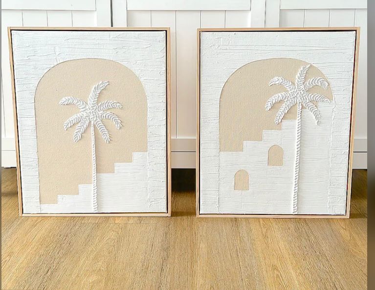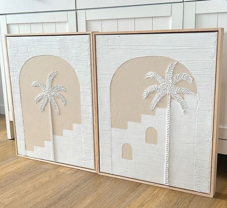 This pair of textured artworks captures the charm of Mediterranean architecture and tropical serenity. Each piece features a raised palm tree set against soft arched structures and minimal beige-white tones. The geometric stairs and window motifs blend seamlessly with the organic form of the palm, symbolizing balance between nature and architecture. With calming neutral shades and three-dimensional texture, these pieces bring a refreshing, coastal elegance to any modern space.