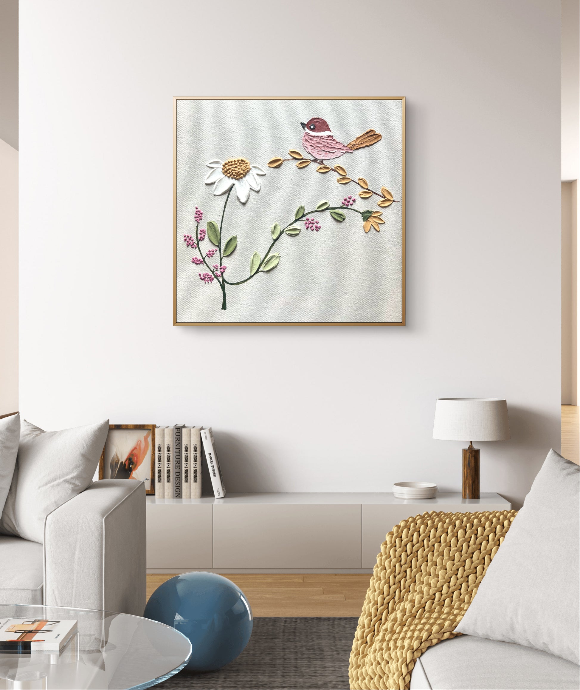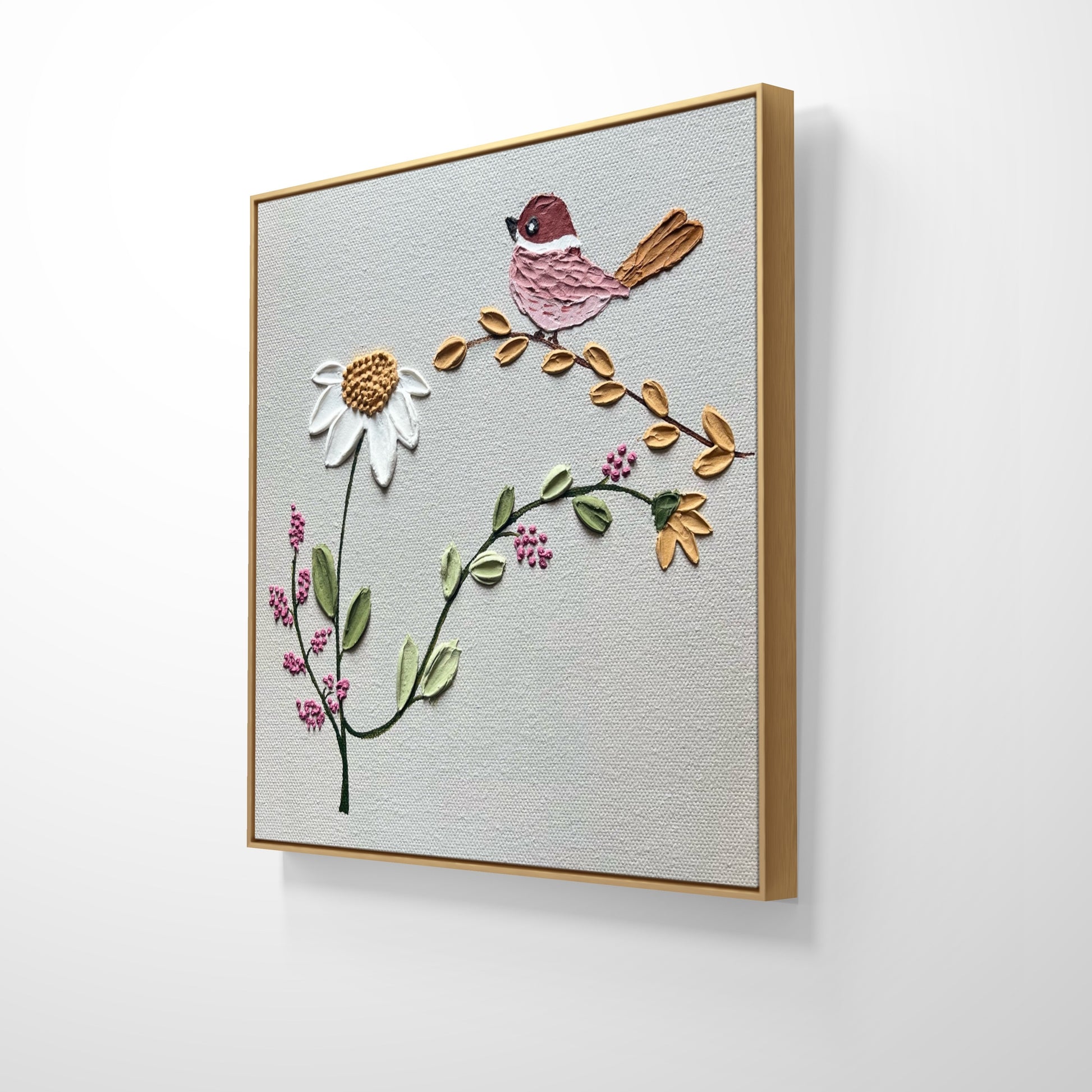 In this charming artwork, a small pink bird with a warm brown tail sits gracefully on a curved golden branch. Below it, a tall white daisy rises proudly, surrounded by soft yellow flowers, gentle green leaves, and clusters of tiny pink blossoms. Each element is slightly raised, giving the piece a lovely texture that feels playful and handcrafted.