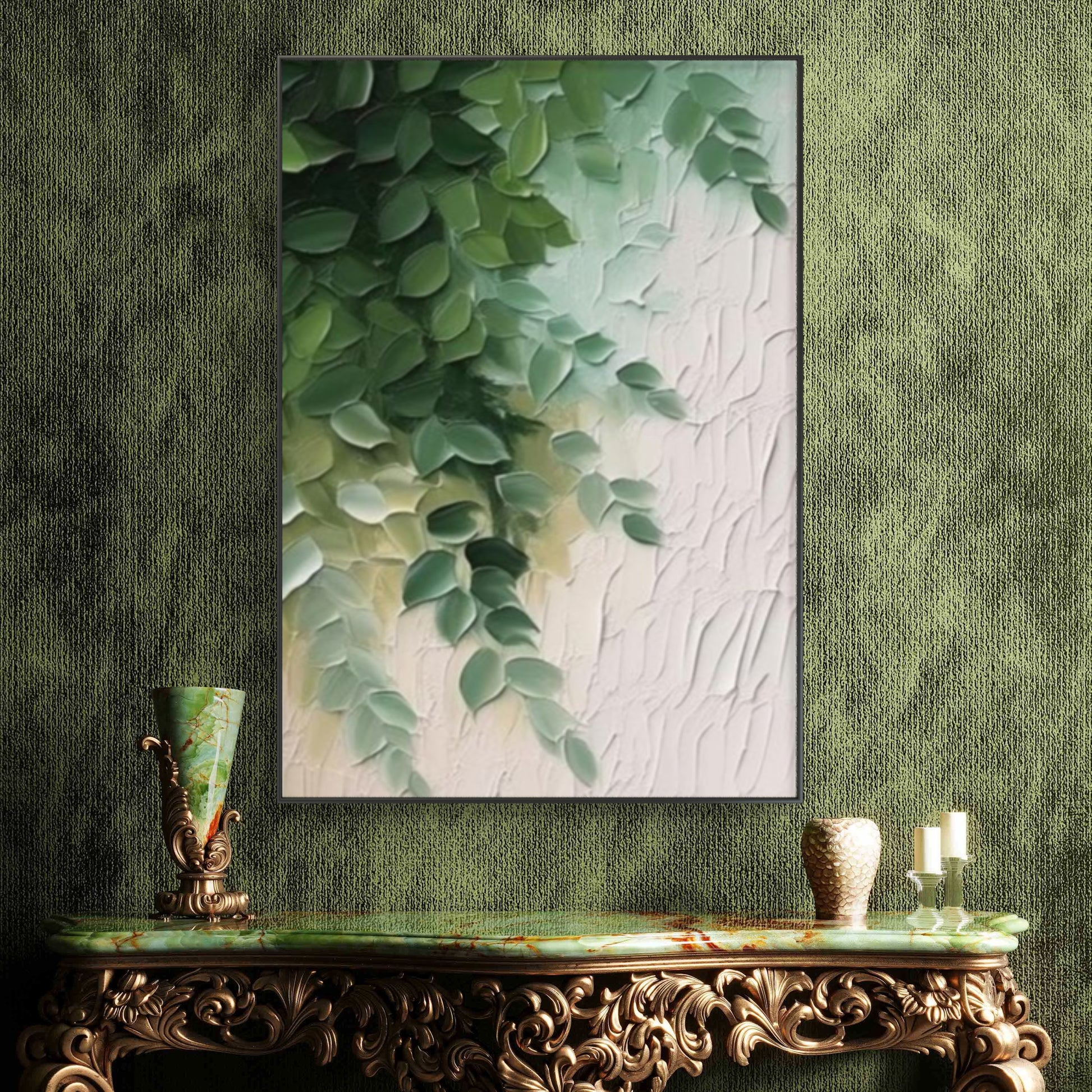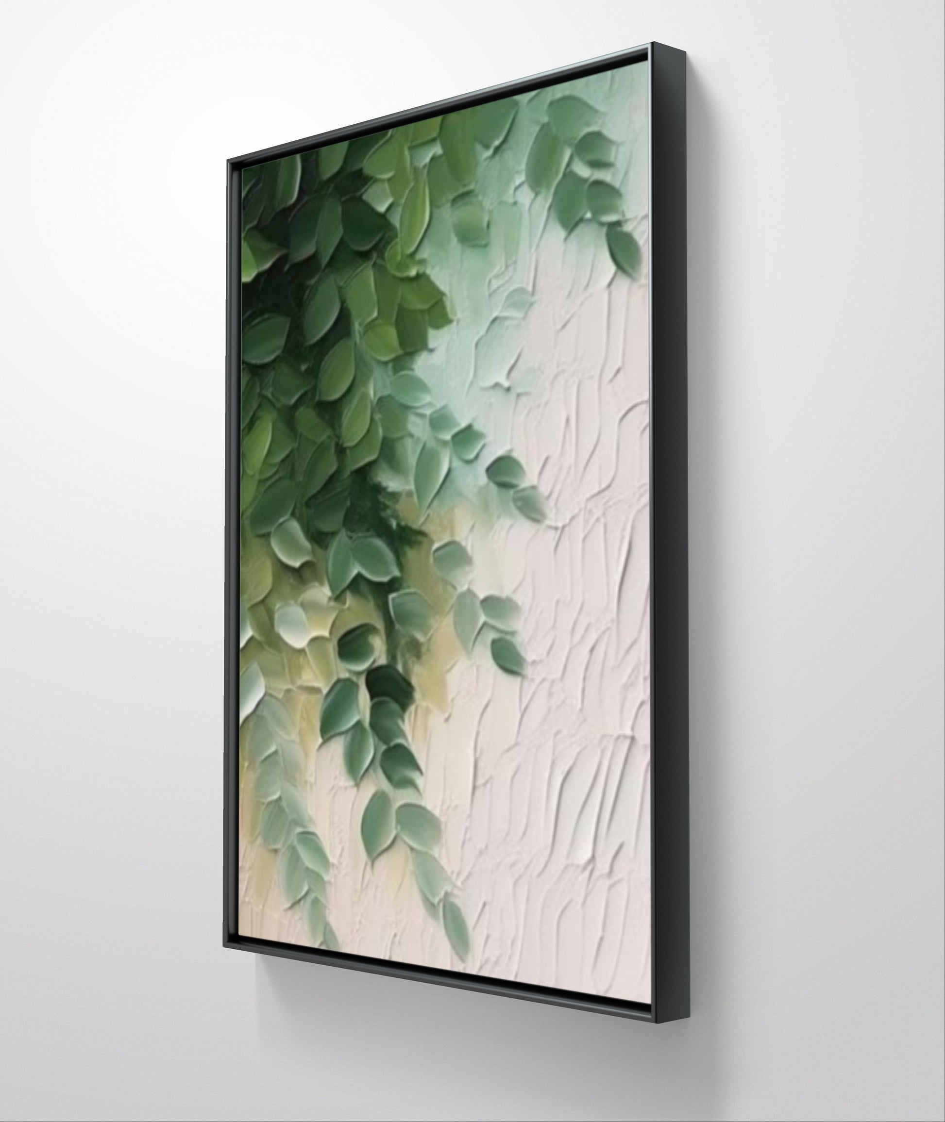 This artwork is a modern, abstract painting with a prominent texture, depicting what appears to be cascading green leaves or foliage. The leaves are rendered in various shades of green, from dark to lighter, suggesting depth and natural variation. They are thickly painted, creating a raised, almost three-dimensional effect that makes them seem to pop out from the canvas.