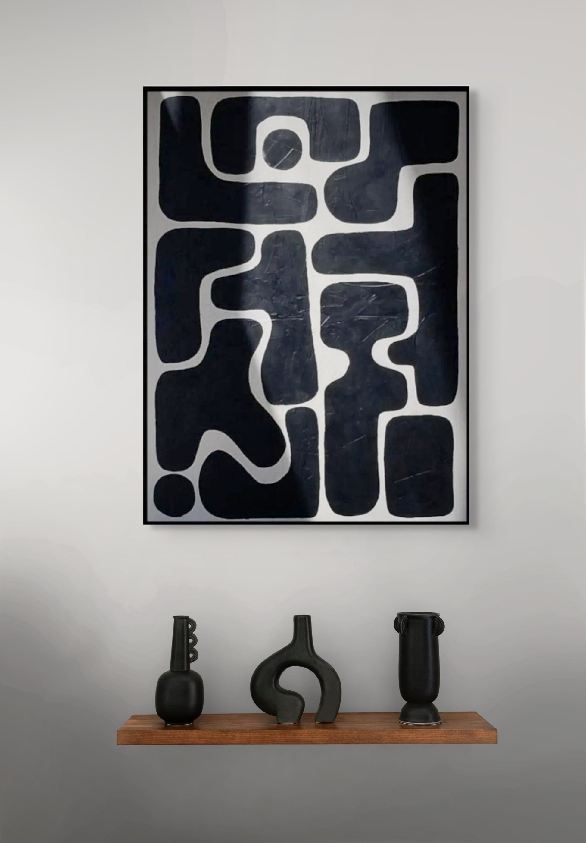 This artwork is a modern, abstract painting. It features bold, black, organic shapes that interlock and flow across a white or very light background. The shapes are irregular and curvilinear, creating a sense of movement and connection within the composition. The overall impression is minimalist yet striking due to the strong contrast between the black shapes and the light background. It's framed in black, which further defines the artwork.