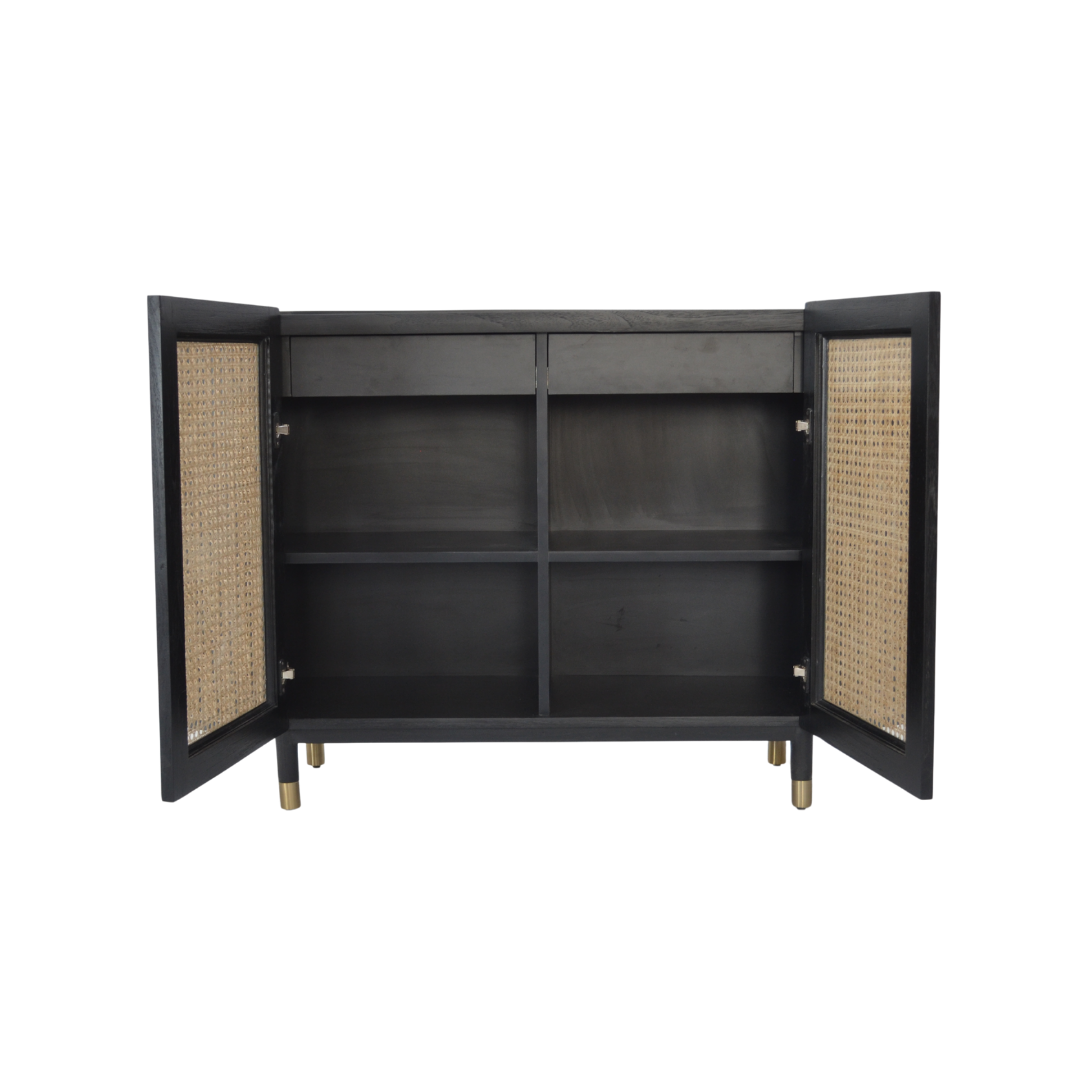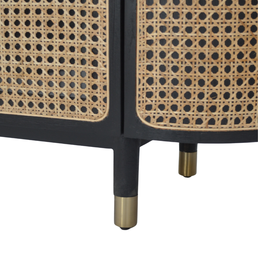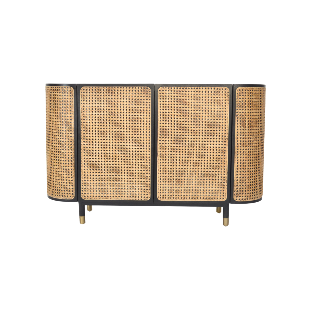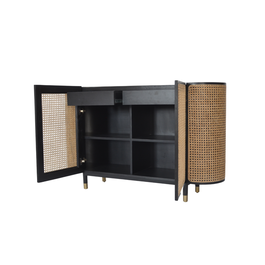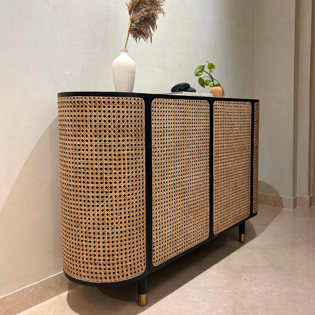The Taru Storage Cabinet is where clean form meets organic detail. Wrapped in handwoven natural indian cane and framed in a bold matte black structure, it brings depth and texture to any space. The curved edges soften its presence, while brass-tipped legs add a hint of elegance. Inside, it’s all about function, ample storage hidden behind beautifully detailed shutters and drawers. Ideal for keeping things tucked away without compromising on style.