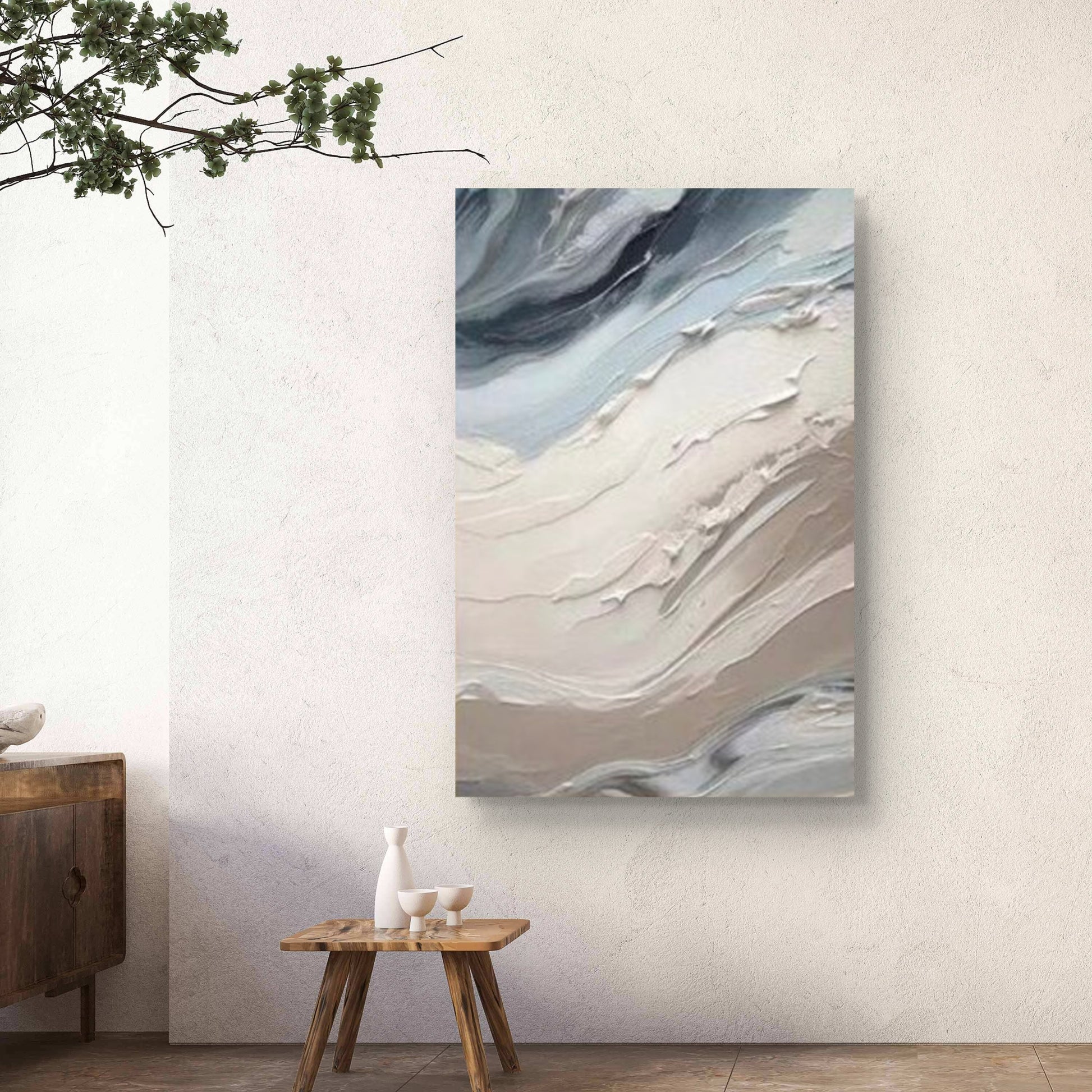 This artwork is an abstract painting with a textured surface, primarily featuring flowing, wavy forms. The color palette consists of soft, muted tones, including shades of light blue, white, and a warm beige or light brown. The brushstrokes create a three-dimensional effect, suggesting layers or waves. The overall impression is serene and calming, reminiscent of natural elements like waves.