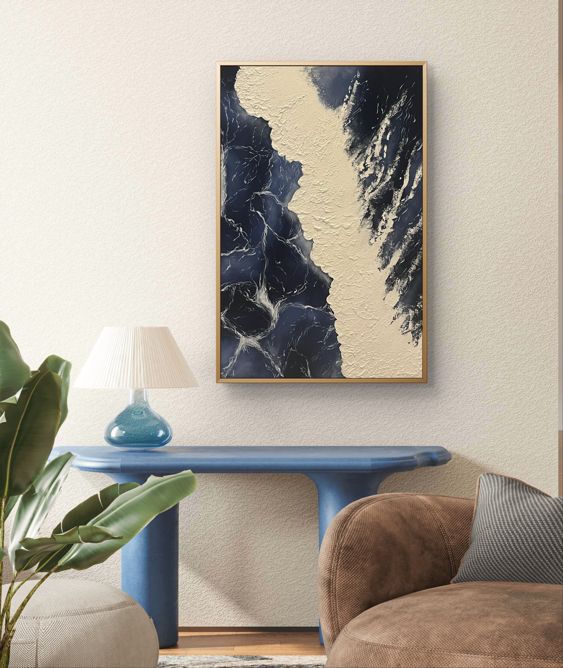 A bold, modern interpretation of waves crashing onto shore. Deep navy blues meet thick white textures, evoking the power and energy of the sea. The textured detailing creates a tactile, almost sculptural effect that stands out on any wall — perfect for contemporary and statement spaces.